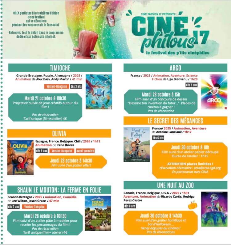 CREA participe à la troisième édition de ce festival organisé par CINEPassion 17 qui se déroulera pendant les vacances de la Toussaint du 18 octobre au 08 novembre 2025 !