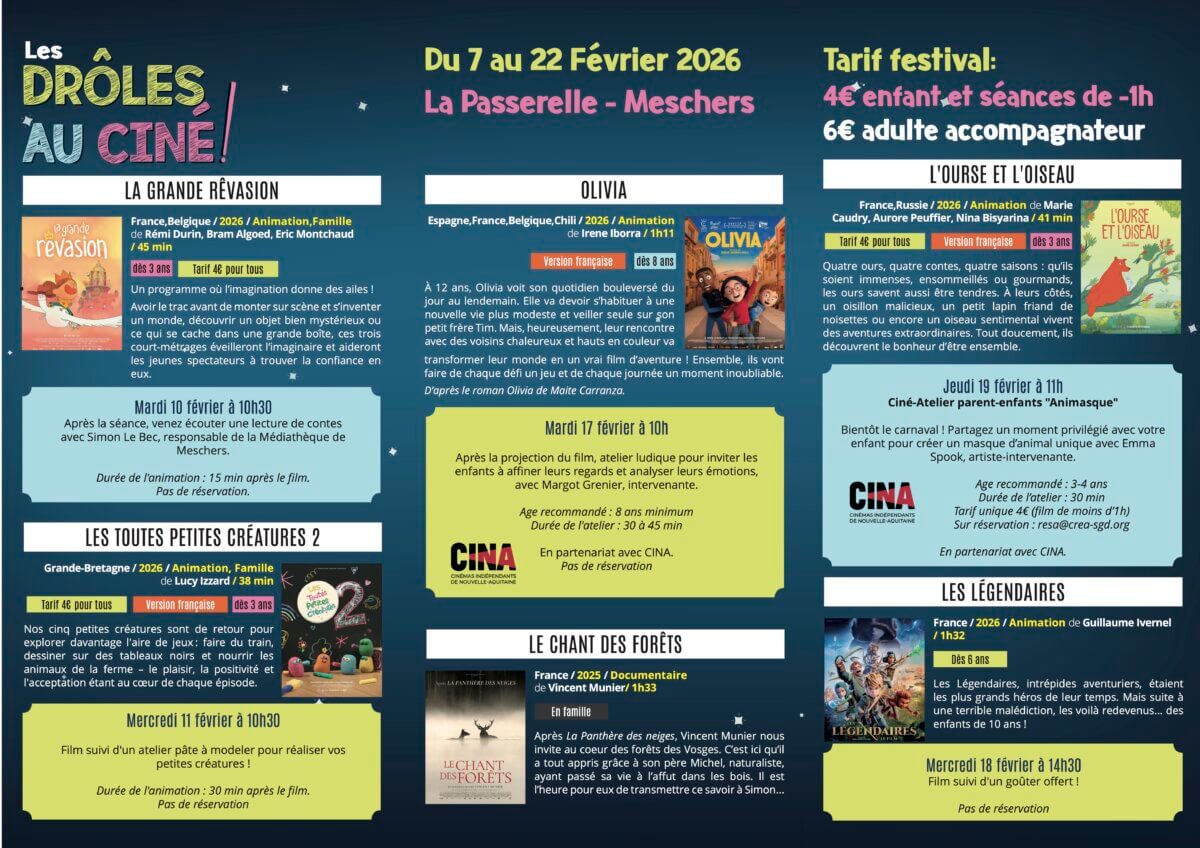 - Ciné-contes autour du film « La Grande Rêvasion » en partenariat avec la médiathèque de Meschers le mardi 10 février à 10h30